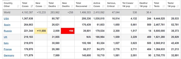 В России число заразившихся коронавирусной инфекцией превысило 221 тысячу человек. По этому показателю страна вышла не третье место в мире.