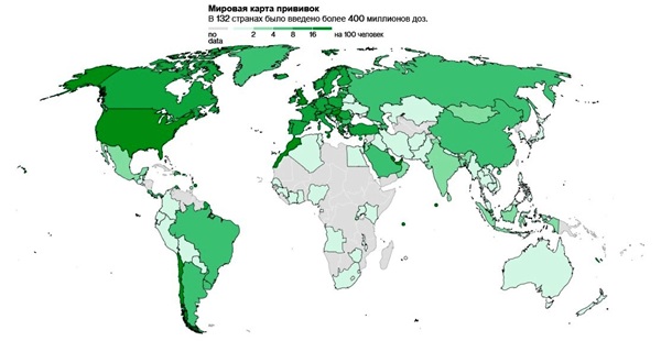 В мире продолжается масштабная кампания по вакцинация населения от коронавируса. Она проходит в 132 странах и на сегодня сделано уже более 400 млн уколов. Последний показатель составил 9,64 млн доз в сутки, сообщает Bloomberg.