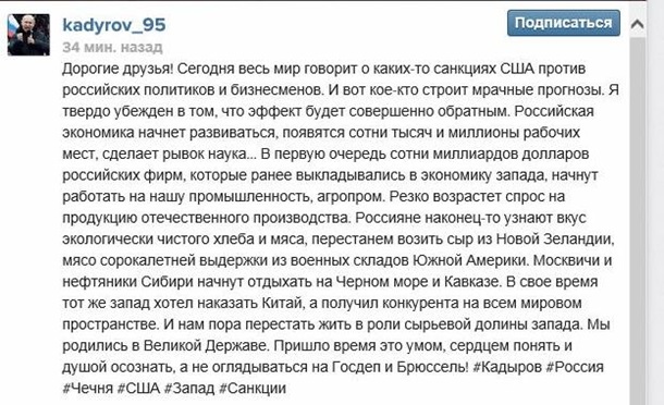 "Россияне наконец-то узнают вкус экологически чистого хлеба и мяса, перестанем возить сыр из Новой Зеландии, мясо сорокалетней выдержки из военных складов Южной Америки. Москвичи и нефтяники Сибири начнут отдыхать на Черном море и Кавказе. В свое время тот же запад хотел наказать Китай, а получил конкурента на всем мировом пространстве. И нам пора перестать жить в роли сырьевой долины запада", - добавил Кадыров.