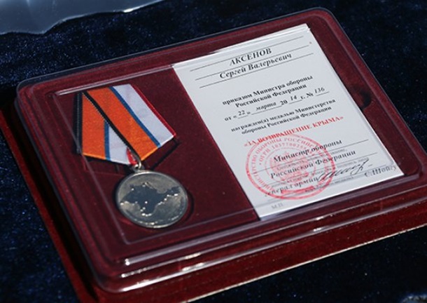 Первым медаль получил премьер-министр Крыма Сергей Аксенов. Также получили медали командование Черноморского флота РФ, российские морпехи и бывшие бойцы спецподразделения Беркут, сообщает пресс-служба ведомства.