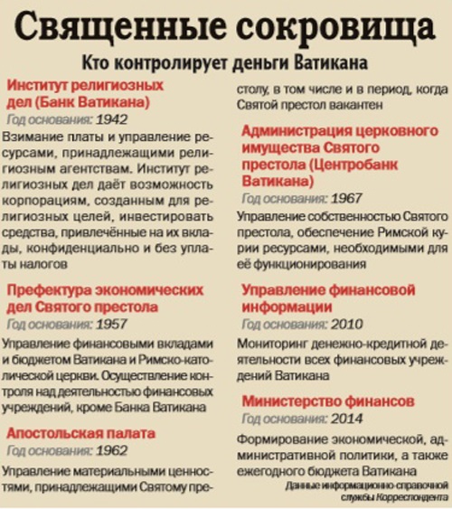 Радикальные преобразования, тектонические сдвиги, эпохальные перемены — такими эпитетами западная пресса в последнее время описывает деятельность папы Франциска, направленную на борьбу с ватиканской коррупцией. Первым делом после прихода к власти он съехал из Апостольского дворца, в котором жили его предшественники, — в подвале дворца находится вход в помещение Банка Ватикана. Пресса восприняла это решение как сигнал о том, что папа намерен осуществлять заявленную им борьбу с коррупцией не только на словах, но и на деле. Похоже, журналисты не прогадали.