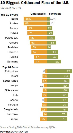 "Десять лет назад во всем мире наблюдался рост антиамериканских настроений, в значительной степени за счет неприятия обществом вторжения США в Ирак. Сегодня, несмотря на недавние обвинения Агентства национальной безопасности США в шпионаже за иностранными лидерами и критикой в мире США за использование беспилотников при осуществлении авиаударов, за исключением нескольких стран, существует мало свидетельств сильного антиамериканизма", - отмечается в отчете.