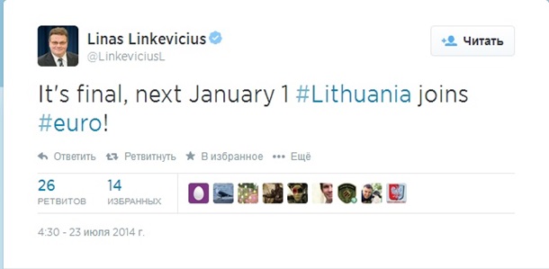 Министр иностранных дел Литвы Линас Линкявичюс заявил, что страна с 1 января 2015 года переходит на евро. Об этом министр написал в своем Twitter в среду, 23 июля.