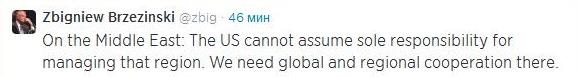 "На Ближнем Востоке: США не могут в одиночку нести всю ответственность за управление в этом регионе. Мы нуждаемся в глобальном и региональном сотрудничестве", - написал он на своей странице в Twitter.