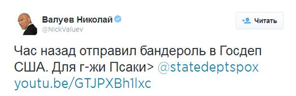 "Час назад отправил бандероль в Госдеп США. Для госпожи Псаки", – написал Валуев.