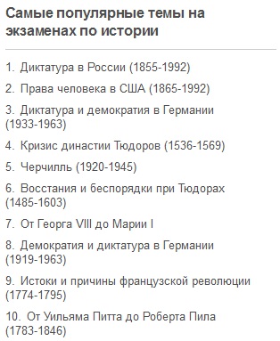 В десятку самых популярных исторических периодов на выпускных экзаменах вошло правление Уинстона Черчилля в Великобритании, истоки и причины французской революции (1774-1795), а также история Германии за период с 1919 по 1963 годы. Три из десяти самых популярных тем экзаменов касаются эпохи правления Тюдоров в Великобритании, все остальные периоды касаются 18-го века или более поздних исторических эпох.