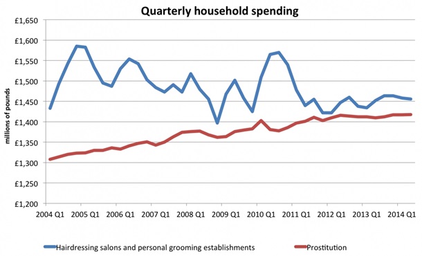 Показатели пользования услугами проституток были немного скромнее за тот же период – на это британцы потратили около 1,42 млрд фунтов. Примерно такую же сумму жители Британии оставили в парикмахерских, салонах и учреждениях по уходу за личной гигиеной.