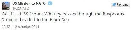 Командный фрегат шестого флота США USS Mount Whitney прошел Босфорский пролив и 11 октября вошел в акваторию Черного моря.