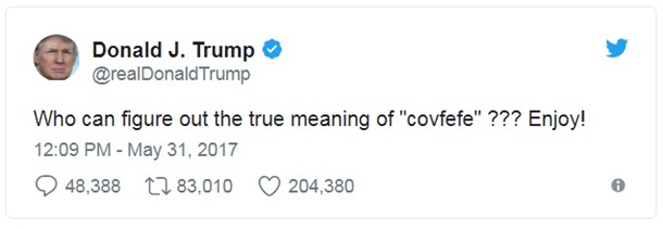 Напомним, слово covfefe родилось 31 мая. В аккаунте Трампа появился незаконченный твит с загадочным covfefe. Пользователи принялись гадать, что означает это слово. Вероятно, Трамп имел в виду слово coverage. В этом случае фраза была незаконченной, но написанной грамотно, и означала бы "Несмотря на постоянную негативную реакцию прессы...". Вскоре эта запись была удалена, но неологизм успел запомниться интернет-пользователям, терявшимся в догадках, что же он означает. Позже Трамп сам предложил читателям угадать значение слова.