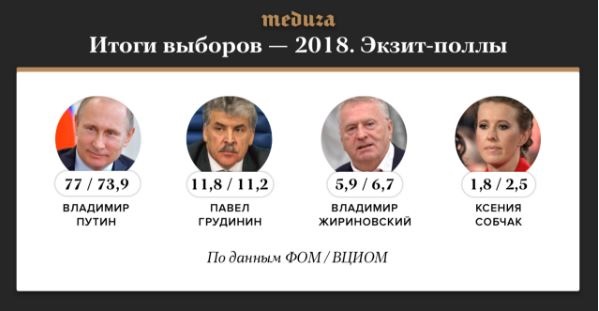 Владимир Путин набирает 73,9% на выборах президента России, свидетельствуют данные exit poll Всероссийского центра изучения общественного мнения (ВЦИОМ), сообщают РИА Новости.Другие кандидаты набрали, по данным экзит-полов ВЦИОМ: кандидат от КПРФ Павел Грудинин - 11,2%, лидер ЛДПР Владимир Жириновский - 6,7%, представитель партии Гражданская инициатива Ксения Собчак - 2,5%, основатель партии Яблоко Григорий Явлинский - 1,6%, остальные кандидаты - менее 1%, недействительных бюллетеней - 1,2%.