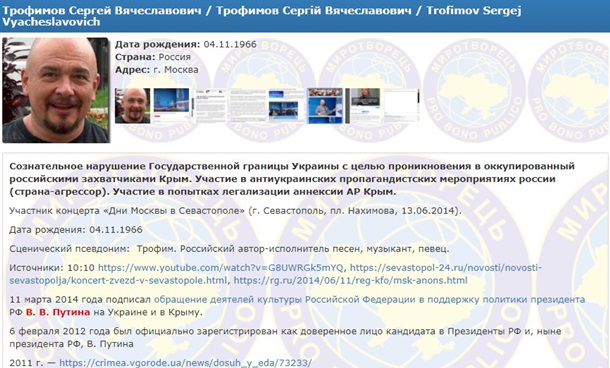 Российский музыкант Сергей Трофимов попал в базу Миротворца за выступления в аннексированном Крыму и поддержку политики президента РФ Владимира Путина. Об этом сообщается на сайте базы.
