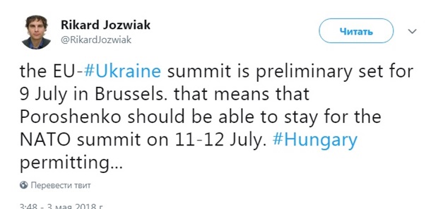 Журналист уточнил, что саммит планируется провести в Брюсселе, добавив, что после президент Украины Петр Порошенко должен будет остаться в Брюсселе для участие в саммите НАТО.