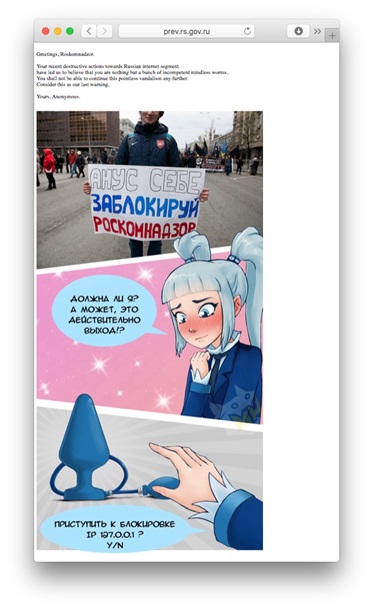 "Приветствуем, Роскомнадзор. Последние ваши деструктивные действия против российского интернета заставили нас поверить, что вы - всего лишь кучка некомпетентных и безмозглых червей. У вас не должно быть возможности продолжать бесполезный вандализм. Считайте это нашим последним предупреждением. Ваши Анонимы", - говорится в послании.