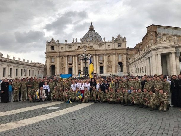 Сегодня в общей аудиенции с Папой Римским участие принимали военнослужащие Вооруженных сил Украины, Национальной гвардии Украины, Государственной пограничной службы Украины, раненые воины АТО, потерявшие мужей на войне женщины, курсанты и оркестр Национальной академии сухопутных войск имени Сагайдачного.