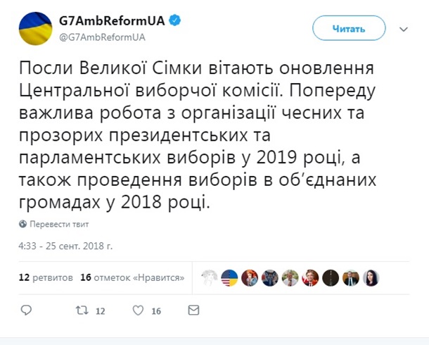 Послы стран Большой семерки приветствуют обновление Центральной избирательной комиссии Украины. Об этом говорится в сообщении в Twitter канадского главы группы поддержки послов G7 в Киеве во вторник, 25 сентября.