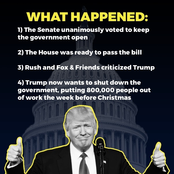 И компромисс был найден – Депутаты предложили временное решение: принять закон о финансировании именно бюрократии, чтобы не оставлять миллионы людей без работы и денег перед праздниками. Трамп сначала согласился. Но после критиков со стороны политологов-консерваторов, которые обвинили президента в неспособности стоять на своем, Трамп заявил, что сделки не будет.