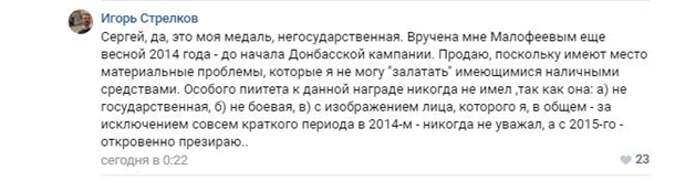 На своей странице ВКонтакте Гиркин подтвердил, что продает награду.