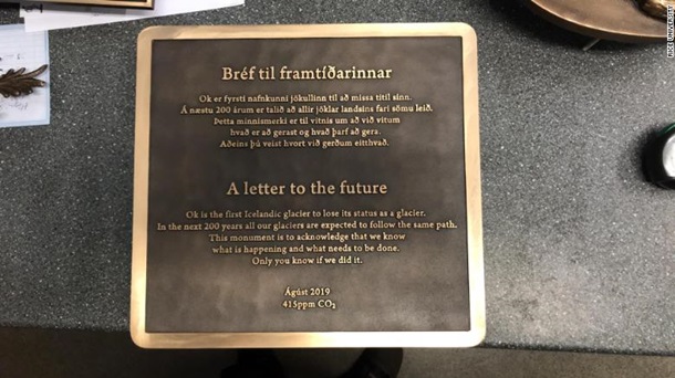 “Ок - это первый исландский ледник, который потерял свой статус ледника. Ожидается, что в ближайшие 200 лет все наши ледники пойдут по одному и тому же пути. Этот памятник должен признать, что мы знаем, что происходит, и знаем, что нужно сделать. Только вы знаете, сделали ли мы это”, - гласит табличка на английском и исландском языках.