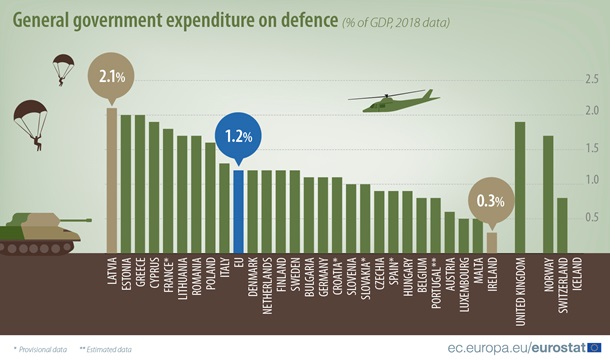 По данным Евростата, больше всех в ЕС такие траты у Латвии. При среднем показателе по ЕС в 1,2% от ВВП Латвия потратила 2,1% своего бюджета на оборонные расходы.