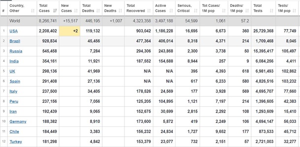 Всего в мире уже 8 266 741 случай заболевания коронавирусом, из них 4 323 358 выздоровели, 446 195 человек умерли.