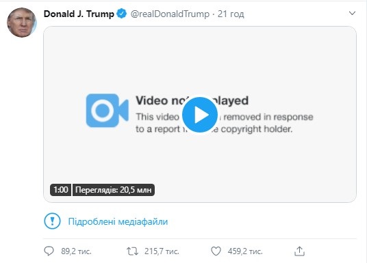 Позже соцсеть заблокировала видеоролик предвыборной кампании главы государства, посвященный памяти афроамериканца Джорджа Флойда, в связи с тем, что на него была подана жалоба о нарушении авторских прав.