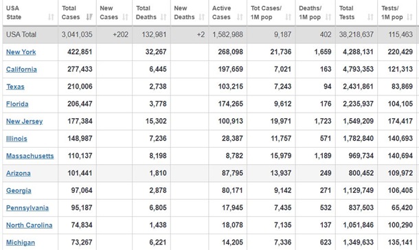 Всего с начала пандемии в США зафиксировано 3 041 035 случаев заболевания, 132 981 из них летальные. Согласно статистике, умирает 401 человек на миллион населения.