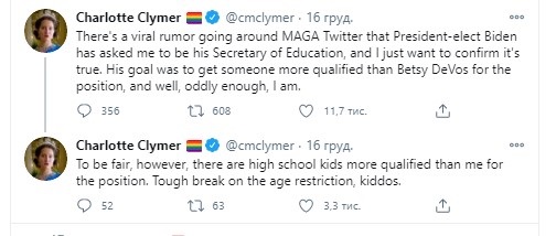 "Ходят слухи, что избранный президент Байден попросил меня стать его министром образования, и я просто хочу подтвердить, что это правда. Его целью было найти на эту должность кого-то более квалифицированного, чем Бетси ДеВос, и, как ни странно, я такая", - написала Клаймер.