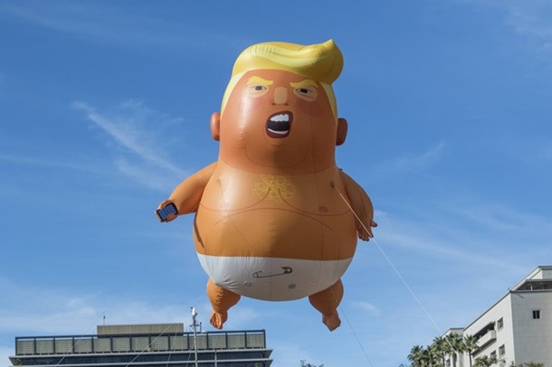Шестиметровый воздушный шар создали перед визитом американского лидера в Великобританию. Впервые “Малыш Трамп” поднялся в небо в 2018 году в знак протеста против приезда в Лондон хозяина Белого дома.