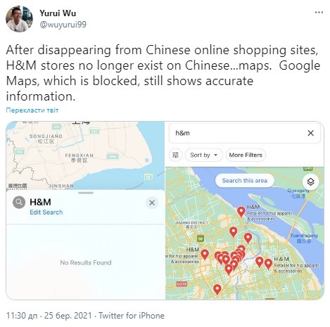 Заявление компании спровоцировало критику Коммунистического союза молодежи и Народно-освободительной армии Китая и повлекло исчезновение магазинов H&M из навигаторов Apple Maps и Baidu Maps в стране, а также удаление с крупнейших китайских онлайн-платформ.