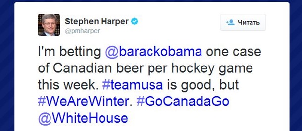 "Я поспорил с Обамой на ящик пива, что хоккейные сборные нашей страны обыграют американцев в Сочи. Американские спортсмены на высоте, но победа будет за нами", - написал Стивен Харпер в своем микроблоге Twitter.