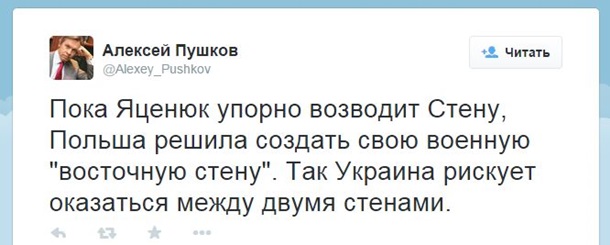 "Пока Яценюк упорно возводит Стену, Польша решила создать свою военную "восточную стену". Так Украина рискует оказаться между двумя стенами", - написал он в Twitter.