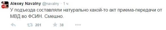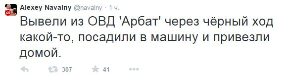 "Вывели из ОВД 'Арбат' через чёрный ход какой-то, посадили в машину и привезли домой… У подъезда составляли… акт приема-передачи от МВД во ФСИН", – написал он в своем микроблоге в Twitter.
