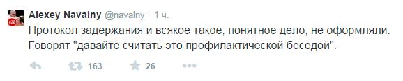 Ранее о своем задержании в центре Москвы оппозиционер сообщил в Twitter. Сотрудники полиции задержали Навального на выходе из здания редакции радиостанции "Эхо Москвы", где он участвовал в прямом эфире.
